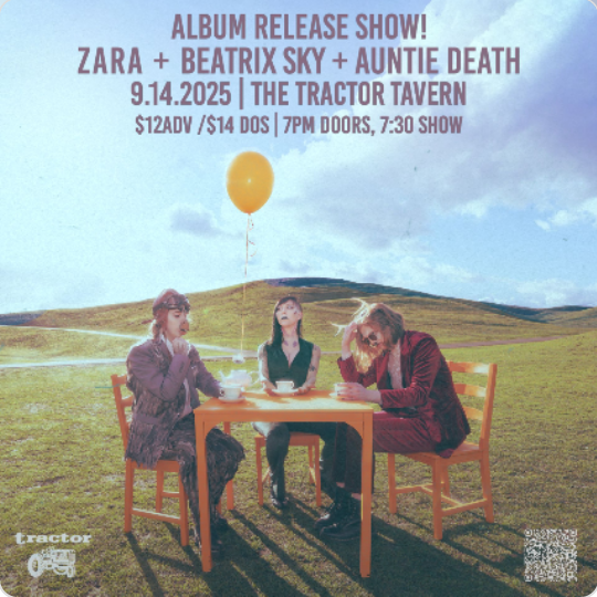 upcoming shows sun . 14 . sep . 2025 Tractor Tavern Album Release Show for Zara !! with Zara, Beatrix Sky doors 7:00pm | show 7:30pm | 21+ tickets $12 advance / $14 day of show Seattle, WA